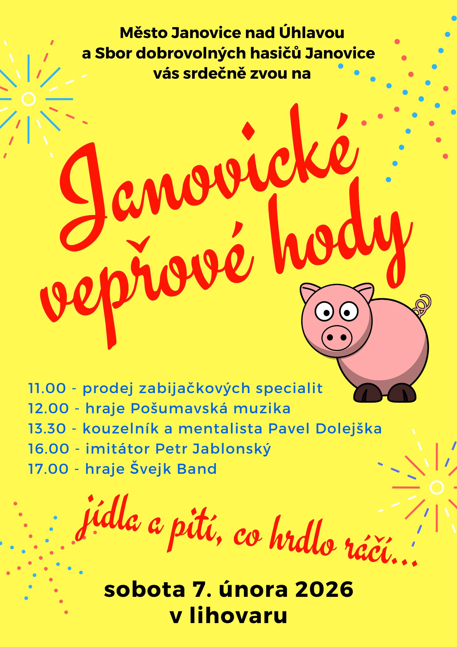 Vepřové hody v lihovaru: hraje Pošumavská muzika a Švejk Band, vystoupí kouzelník a mentalista Pavel Dolejška a imitátor Petr Jablonský. Zve vás město Janovice nad Úhlavou a SDH Janovice.